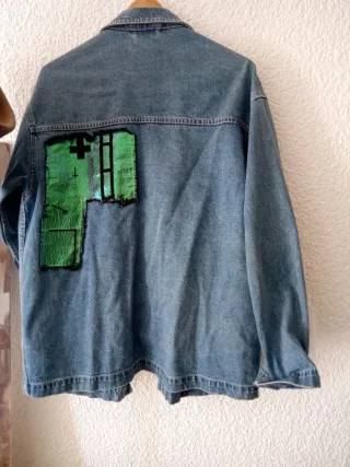Chaqueta vaquera con un llamativo parche decorativo. - Diseño único con parche de lentejuelas verdes y detalles negros. - Estilo moderno y original.