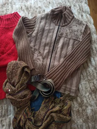 Conjunto de dos jerséis A. Domínguez, pantalón tejano, cinturon y foulard. - Jersey de punto rojo Adolfo Domínguez entallado talla 38 - Chaqueta de punto marrón con cremallera. - Pantalón vaquero azul 38 - cinturon vaquero 102cm - foulard