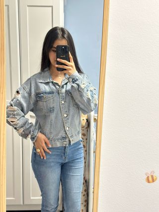 Chaqueta de mezclilla con un diseño moderno y desgastado. - Mangas con detalles rasgados y adornos. - Corte clásico de chaqueta vaquera.