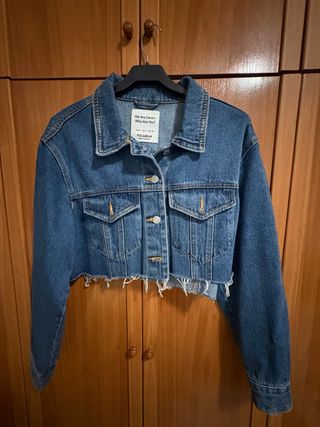 Cazadora vaquera corta con acabado deshilachado. - Diseño cropped. - Cierre de botones. - Bolsillos en el pecho.