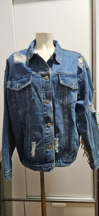 Chaqueta vaquera con un diseño moderno y llamativo. Es amplia, queda bien, desde una M, más oversize, hasta una 46...48 - Detalle de flecos en la parte delantera y trasera, con brillos, tachuelitas - Cuello camisero. - Cierre de botones. - Cuello, Bajo y puños , efecto deshilachados. Sisa, 69 cm Cuerpo, 62 cm Largo, 64 cm