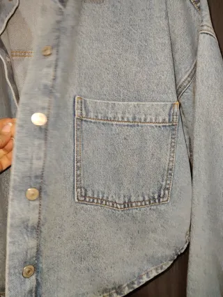 Chaqueta tipo vaquera, guateada tipo anorak. Muy ligera, tiene el cuello, los puños y el bajo de tela vaquera, en muy buen estado. Es muy calentita, parece que llevas una chaqueta vaquera, pero con más abrigo. Es la talla xs, pero muy holgada, realmente es como una S. Los bolsillos del pecho son solo adorno.