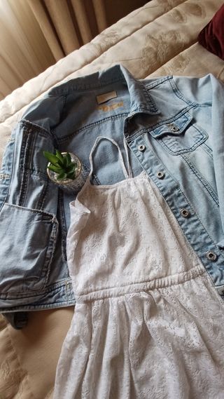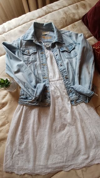 Precioso conjunto compuesto por un vestido blanco de encaje y una chaqueta vaquera celeste. Ideal para un look fresco y veraniego. - Vestido de algodón blanco con detalles de encaje. - Chaqueta vaquera de algodón, ligera y cómoda.