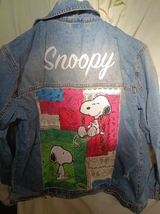 Chaqueta vaquera con un diseño único de Snoopy y parches. - Estampado de Snoopy. - Diseño patchwork con diferentes estampados. - Cuello clásico. - Cierre de botones.