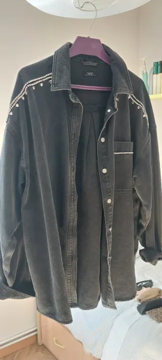 Chaqueta vaquera de Zara con un diseño oversize y detalles de tachuelas. - Diseño con tachuelas plateadas. - Bolsillos frontales con solapa. - Cierre de botones metálicos. - Nueva a estrenar.