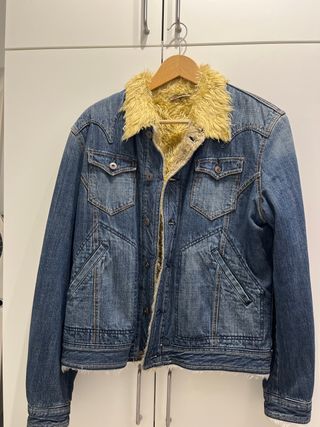 Chaqueta vaquera clásica con un toque cálido y moderno. Se vende por no haber tenido uso ninguno como se puede apreciar ya que me está grande. - Diseño vaquero con efecto desgastado. - Cuello forrado de borreguito blanco. - Cierre de botones metálicos. - Dos bolsillos en el pecho con solapa y botón. - Dos bolsillos laterales.