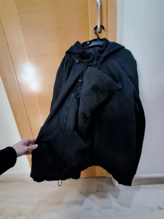 Cazadora negra diseñada para porteo, talla M. Cuenta con capucha y cierre de cremallera. - Capucha integrada. - Cierre frontal con cremallera. - Cordón ajustable en el bajo. - Leva cremallera por delante y por detrás para poder portear de las dos maneras - Al ser como tela vaquera aparece que esta desteñida pero esta en perfecto estado. Usada 4 veces contadas. - Lleva borreguillo dentro