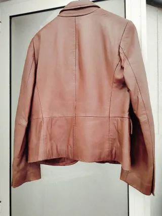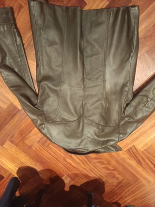 De buena piel verde botella con mangas anchas que se recogen con trabillas. También lleva trabillas en el bajo.Muy favorecedora.La talla es referencia,figura con una 44 pero yo llevo la 38 y me queda perfecta.Yo creo que se adapta desde una 38 hasta una 42