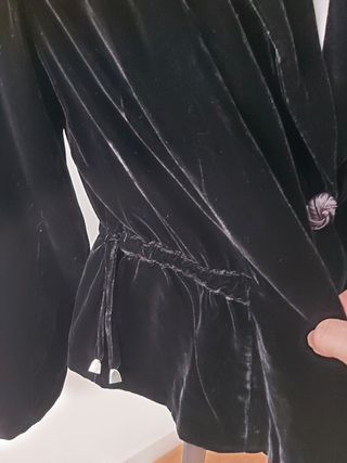 Ajusta en la cintura con cordón, forrada. Talla 42/44 aunque la etiqueta indica 46. Medidas hombro 44, alto 55 y manga 57. Hecha en España. Vintage