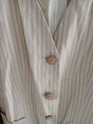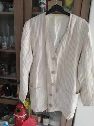 Elegante chaqueta vintage de rayas. Ideal para un look clásico y atemporal. - Diseño de rayas verticales. - Cierre de botones. - Bolsillos funcionales. - Tejido ligero.