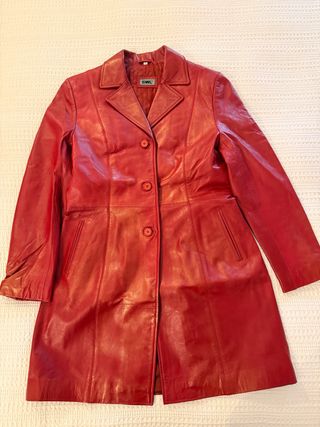 Chaqueta de piel vintage, marca SWL, diseño 3/4, Talla L (40-42), color rojo Medidas aproximadas: - Largo: 94 cm - Ancho hombros: 43 cm - Pecho: 49 cm - Cintura: 44 cm - Cadera: 54 cm - Largo mangas: 62 cm