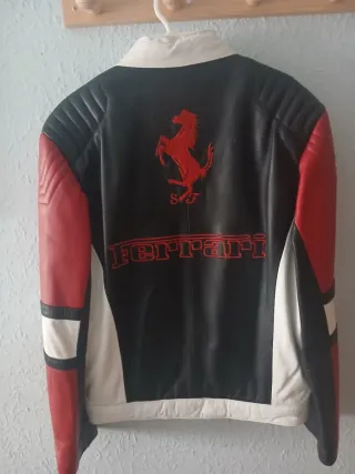 Chaqueta de cuero auténtico de cordero, estilo racing inspirada en Ferrari. Diseño en negro, rojo y blanco con bordados y bolsillo con cremallera. El cuero está blando y flexible, en buen estado general. Los botones de presión no enganchan (arreglo sencillo).