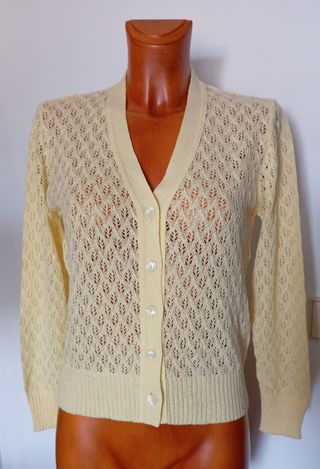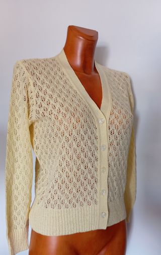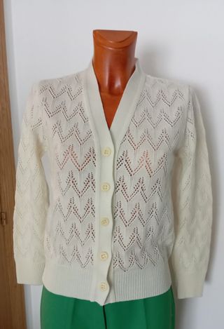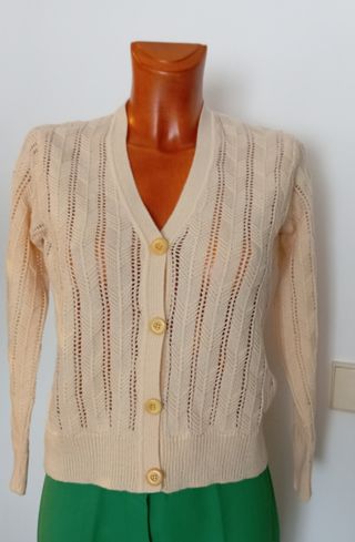 Chaqueta vintage en color vainilla suave. Calada y con botones delanteros. Nueva a estrenar. Restos de tienda. Talla 38/36 aproximadamente. Medidas: largo 53cm sisas 49cm hombro 38cm largo de manga desde parte alta del hombro a puño 59'5cm Tejido ligero.