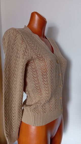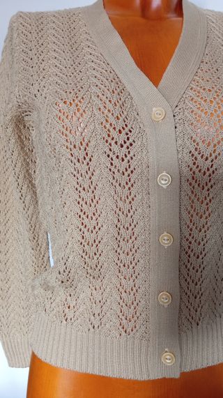 Chaqueta vintage calada color beige café. Vintage, nuevo, restos de tienda. Talla 38/40proximadamente. ✨🧵MEDIDAS🧵✨ Largo 51'5cm Sisa 44cm Hombro 35cm Largo de manga medido desde lo alto del hombro al puño 55cm.