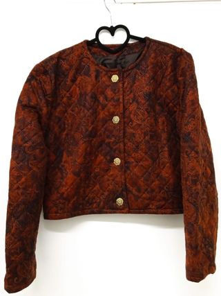 Muy bonita y versátil, talla 42, fabricada en España, con botones joya, y con forro. Medida de sisa a sisa 52 cm, medida de largo 46 cm. Color teja y negro.