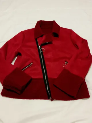 Original chaqueta modificada con botones de auténtico cuero rojo que le da un toque especial. El cierre es por dentro de la cenefa con automáticos a presión.