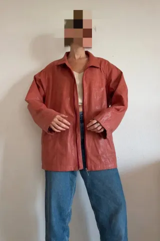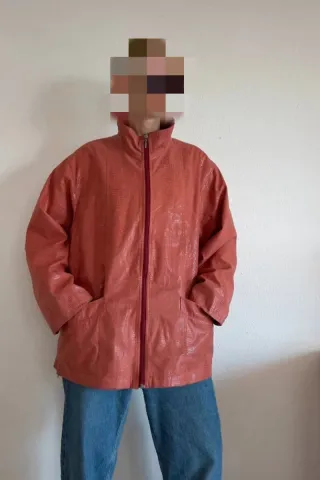 Chaqueta de corte 3/4 con un discreto relieve que imita la piel de serpiente. Brilla ligeramente al sol. Precioso color coral. Corte amplio. Cremallera hasta el cuello. Estilo vintage. Medidas en las fotos.