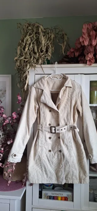 Chaqueta de pana con un estilo vintage. Talla S Usada, pero aun con vida. Algunos signos de uso Tela pana on forro - Diseño de doble botonadura. - Cinturón a juego. - Cuello solapa.