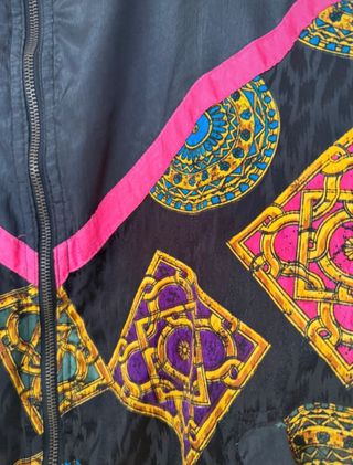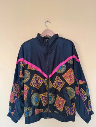 Chaqueta de estilo retro de los años 90. - Diseño llamativo con estampado geométrico y circular. - Detalles en color rosa vibrante. - Cuello alto y cierre de cremallera. - Puños y cintura elásticos.