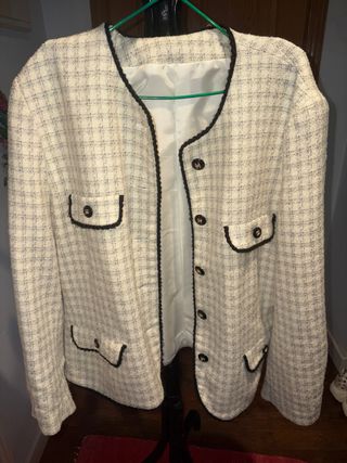 Chaqueta de estilo clásico, inspirada en la moda de los años 80. Presenta un diseño elegante y atemporal. 40 cm de hombro a hombro 50 de axila a axila - Patrón de cuadros - Ribete negro - Botones frontales - Bolsillos decorativos