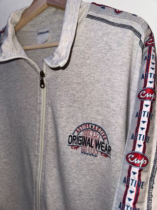 Conjunto de chándal vintage del Real Madrid. - Chaqueta con cremallera completa. - Pantalón a juego. - Detalles de diseño característicos de la marca. Da poca talla