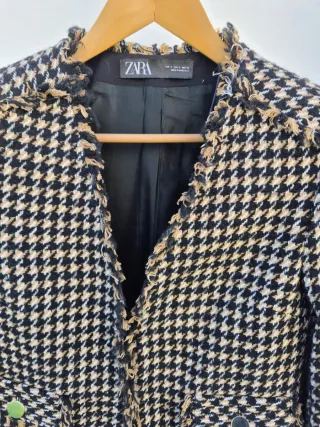 Elegante chaqueta de Zara con un diseño clásico y atemporal. - Patrón de pata de gallo en blanco y negro. - Acabado con flecos y detalles metálicos en los bordes. - Corte estructurado.