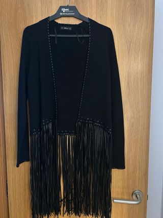 Chaqueta de punto con detalles de flecos. - Diseño abierto. - Acabado con flecos largos en la parte inferior. - Ribete decorativo en los bordes.
