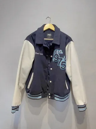 Chaqueta estilo universitario de Zara con diseño bordado. - Mangas de color blanco. - Cuerpo de color azul marino. - Puños y cuello con detalles de rayas.