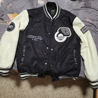 Chaqueta estilo varsity de Zara con mangas blancas y cuerpo negro. - Diseño con parches. - Inscripción make your choice, embrace the changes to come bordada. - Puños y cuello de canalé. -cierre de botones
