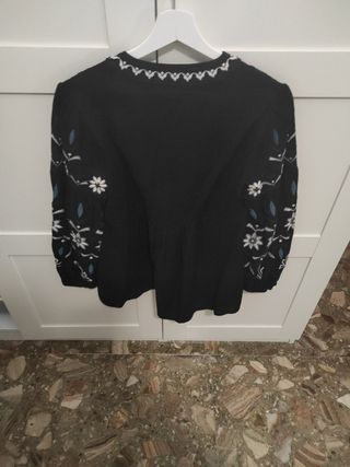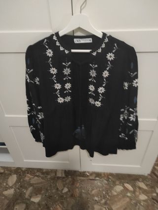 Chaqueta Zara tipo Universitaria Bomber . De lana, con bordados y forro calentito . Está sin estrenar, tiene cosidos los bolsillos, tal como vino de la tienda . Pone talla S pero es muy grande. Talla M real