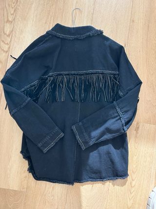Chaqueta vaquera negra con un diseño único. - Detalle de flecos en la parte delantera. - Tachuelas decorativas en cuello, puños y bajo. - Cierre de botones metálicos. YO ME LA HE PUESTO Y UTILIZO UNA TALLA S