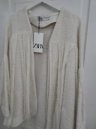 Chaqueta de la marca Zara, a estrenar y con etiqueta. - Diseño con flecos largos en mangas y parte delantera. - Tejido texturizado con pequeños detalles brillantes. - Corte abierto y mangas acampanadas. - Talla M. Cinturón no incluido
