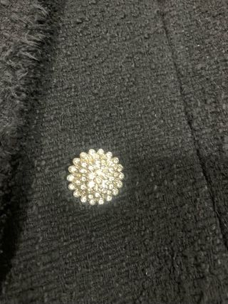 Elegante chaqueta tipo americana de Zara con un diseño tweed y detalles de botones joya. - Diseño de doble botonadura. - Acabado con flecos en cuello y puños. - Bolsillos frontales con solapa.Solo venta en mano zona sur de Madrid