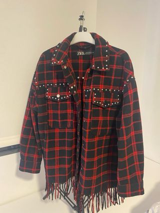 Camisa de Zara con un diseño llamativo y moderno. - Estampado de cuadros en rojo y negro. - Detalle de tachuelas plateadas en cuello, bolsillos y mangas. - Adorno de flecos en el bajo.