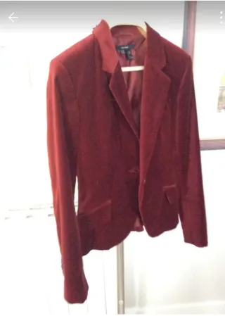 Elegante chaqueta de acabado terciopelo en color rojo/granate. Un básico para añadir un toque sofisticado a cualquier look. - Diseño clásico con solapas. Es talla M pero talla poco. Medidas: manga 60 cms., ancho medido por los hombros 40 cms., ancho medido por debajo de las mangas 42 cms. y largo 57 cms. Está en perfecto estado porque la he puesto muy poco.