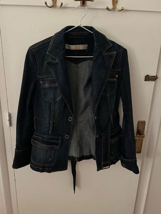 Chaqueta tejana de corte entallado. - Diseño con solapas. - Cierre de botones. - Bolsillos frontales con solapa. - Cinturón ajustable en la cintura.