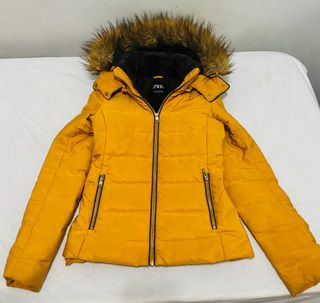 Chaqueta de invierno de la marca Zara, con un llamativo color amarillo. - Capucha con pelo sintético. - Cierre de cremallera frontal. - Bolsillos laterales con cremallera.