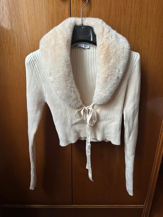 Chaqueta de punto con cuello de pelo sintético. - Diseño de canalé. - Cierre de lazada. - Manga larga. Cuello extraíble