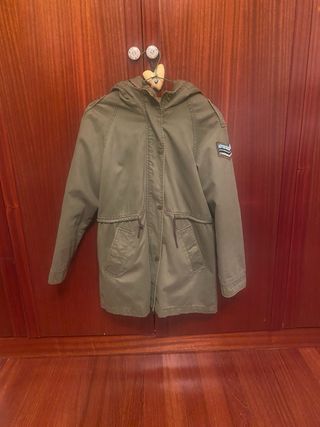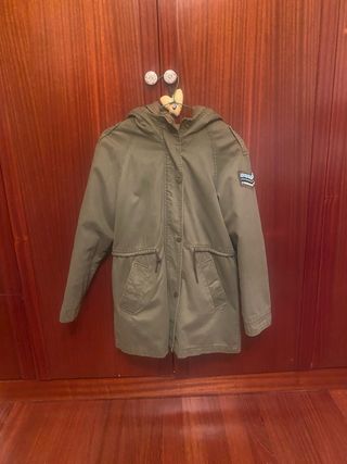 Chaqueta de estilo militar en tono verde oliva, perfecta para un look casual. - Diseño con capucha. - Cierre de botones y cordón ajustable en la cintura. - Dos bolsillos delanteros. - Detalle de parche en la manga.