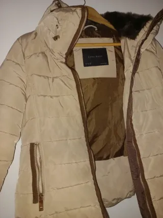 Chaqueta de Zara Basic en color beige, con capucha y detalles de cremallera. - Capucha con pelo sintético. - Cierre de cremallera frontal. - Bolsillos laterales con cremallera. - Forro interior.