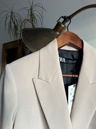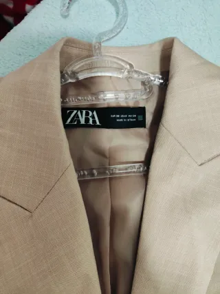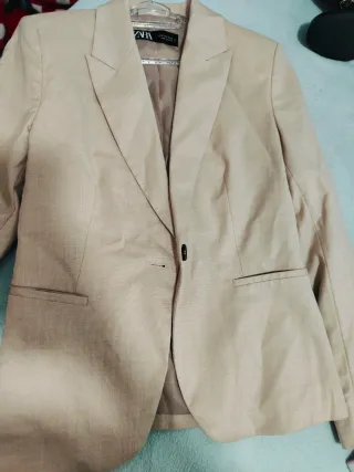 Chaqueta de traje elegante de la marca Zara. - Color beige neutro. - Diseño clásico de chaqueta. - Confeccionada con atención al detalle.