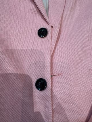 Preciosa chaqueta de vestir en color rosa con forro interior. Cierre de un botón. Dos bolsillos frontales con solapa. Cuello solapa clásico. Botón original de repuesto. En PERFECTO ESTADO.