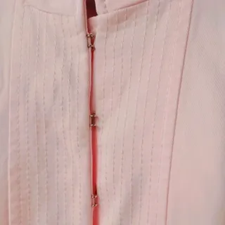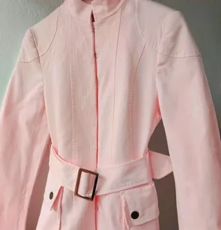 Chaqueta elegante de color rosa. - Diseño con cuello alto. - Cierre frontal con corchetes. - Cinturón a juego con hebilla. - Bolsillos frontales con botón.