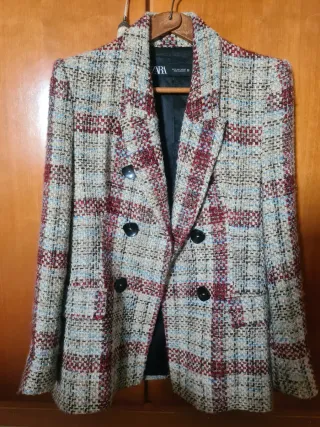 Chaqueta blazer de Zara con un diseño de cuadros en tonos tierra, rojo burdeos y azul. Es una prenda elegante y versátil. - Diseño de cuadros - Cierre cruzado con botones - Cuello solapa - Bolsillos de solapa