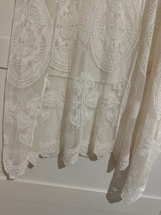 Elegante chaqueta larga de encaje, perfecta para añadir un toque especial a cualquier atuendo. - Diseño de encaje intrincado. - Corte largo y fluido. - Acabado delicado.