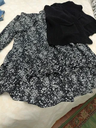 Conjunto de vestido y chaqueta. - Vestido con estampado floral. - Chaqueta de punto. - Diseño en blanco y negro.