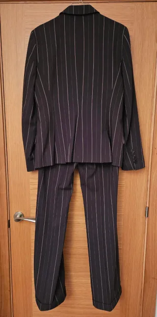 Elegante traje de dos piezas con raya diplomática. Incluye chaqueta y pantalón. - Chaqueta cruzada con botones. - Bolsillos frontales en la chaqueta. - Pantalón de corte recto. - Talla pantalón: 38 Talla chaqueta: 40 - Usado en dos eventos - 100 % Lana - Necesita limpieza - Está en perfecto estado