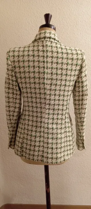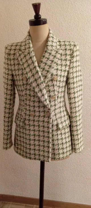 Elegante chaqueta de tweed para mujer, con un diseño clásico de doble botonadura. - Patrón de pata de gallo. - Tejido texturizado con hilos verdes y blancos. - Cuatro botones dorados en la parte frontal. -Impecable.