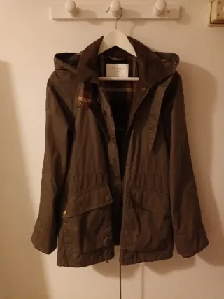 Chaqueta encerada de la marca Barbour. Medidas foto Sólo envíos - Diseño clásico con capucha. - Bolsillos frontales con solapa. - Cierre de cremallera y botones a presión.