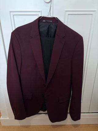 Elegante traje de dos piezas en color granate. - Chaqueta con solapa de muesca. - Cierre de dos botones. - Bolsillos frontales con solapa. - Puños con botones. - Pantalón a juego. Puesto en una ocasión. Como nuevo.